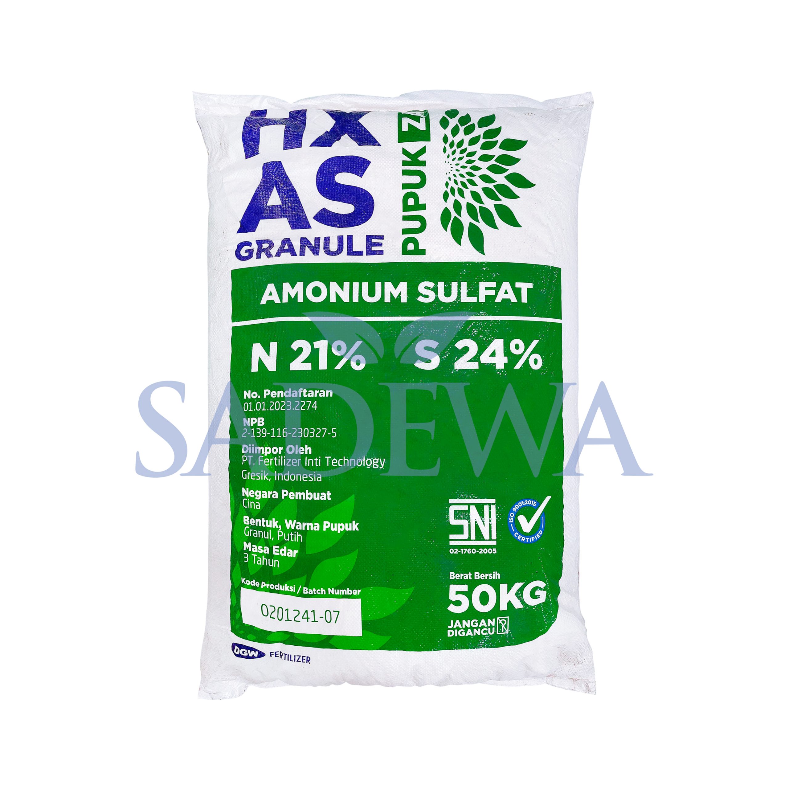 HX AS GRANULE adalah pupuk Amonium Sulfat yang berbentuk granul putih dengan kandungan Nitrogen 21% dan Sulfat 24%. Pupuk ini mampu meningkatkan pertumbuhan vegetatif dan generatif tanaman serta meningkatkan kualitas mutu (Aroma, Rasa dan Warna Buah/Umbi).