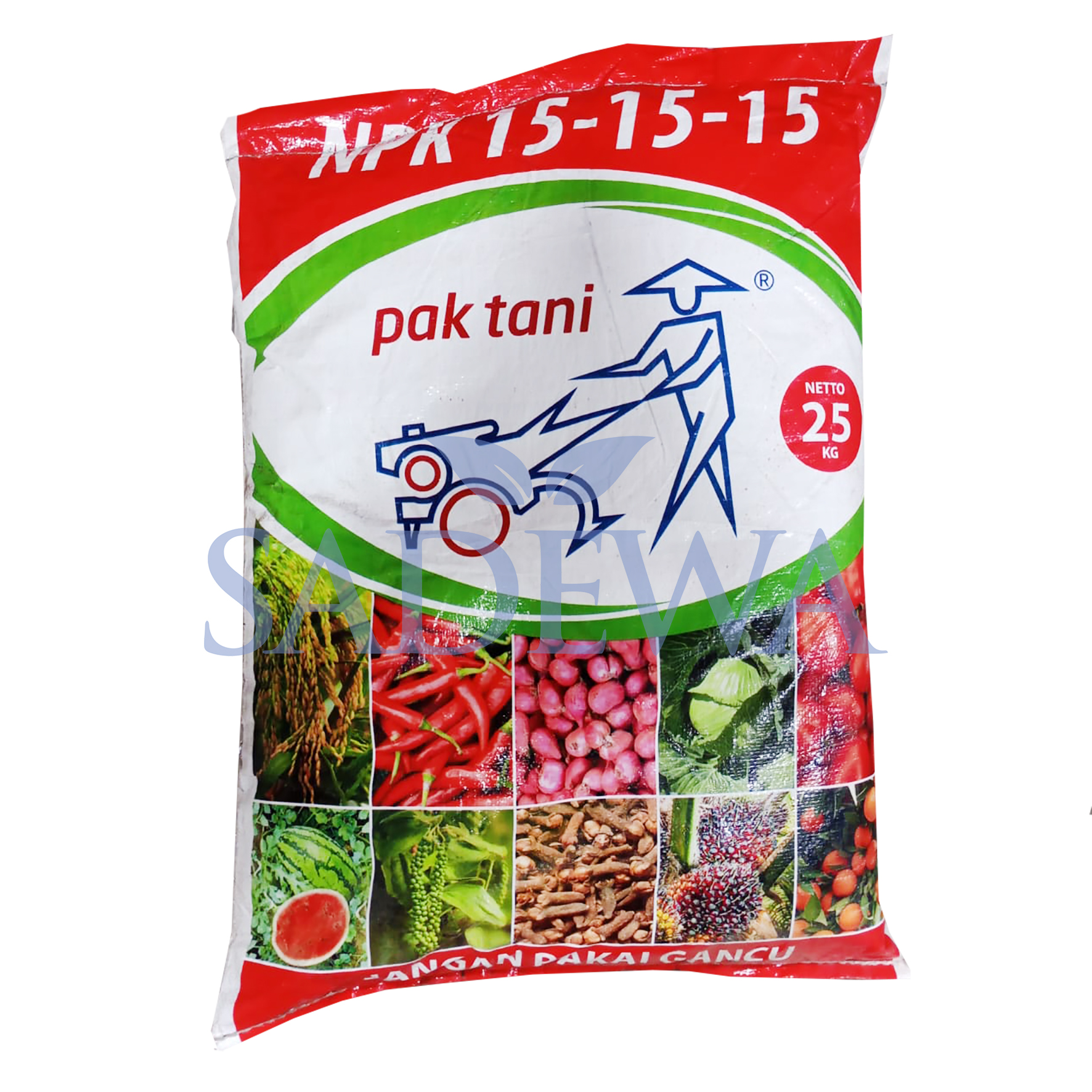 Pupuk NPK 15-15-15 adalah pupuk compound granular yang mengandung unsur N-P-K yang seimbang sesuai dengan kebutuhan tanaman. Pupuk ini bisa digunakan untuk pupuk dasar maupun pupuk susulan untuk tanaman bawang, kentang, wortel, cabe, tomat, semangka, melon, timun, kubis, kol bunga, tembakau, kedelai, ubi kayu, kacang-kacangan, padi, jagung, apel, jeruk, mangga, anggur, strawberry, cengkeh, coklat, lada, karet dan kelapa sawit.